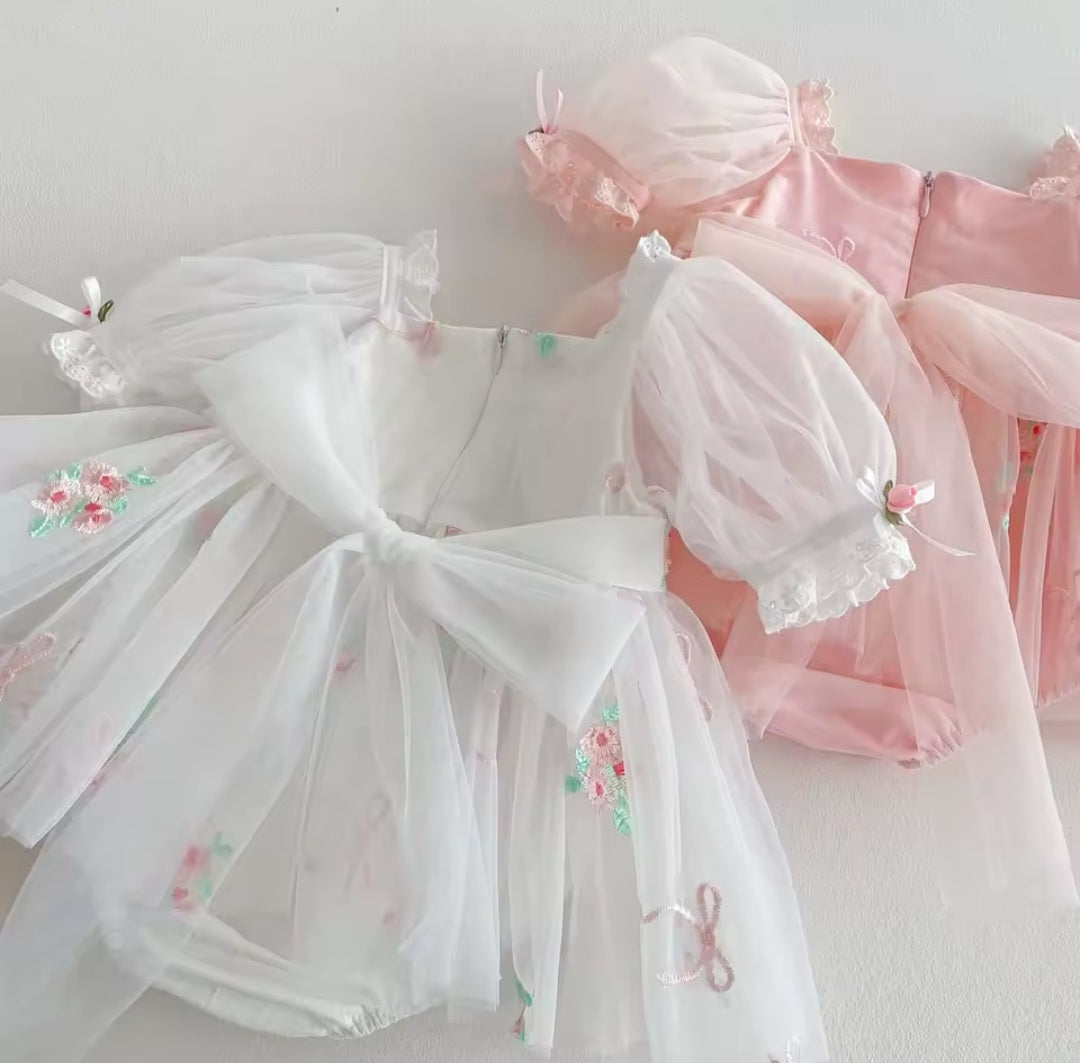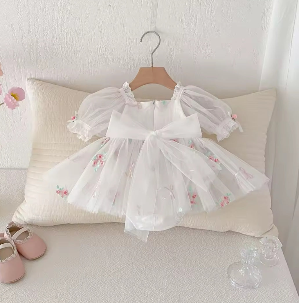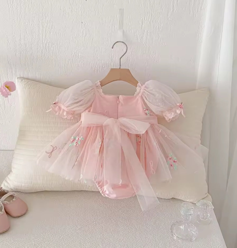 Get your little princess ready for her special day with this adorable romper dress. Perfect for birthday parties or special occasions, this dress is made with soft tulle and floral embroidery details.
